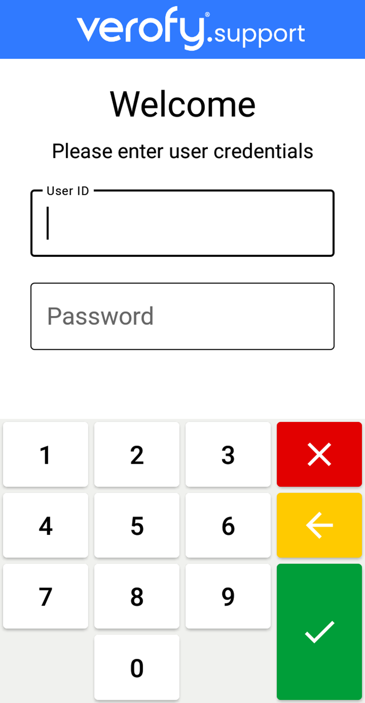 - Log out of the Supervisor login by clicking into Settings, then Exit App. Log in with the new user ID logins you created. Press the green tick to continue.