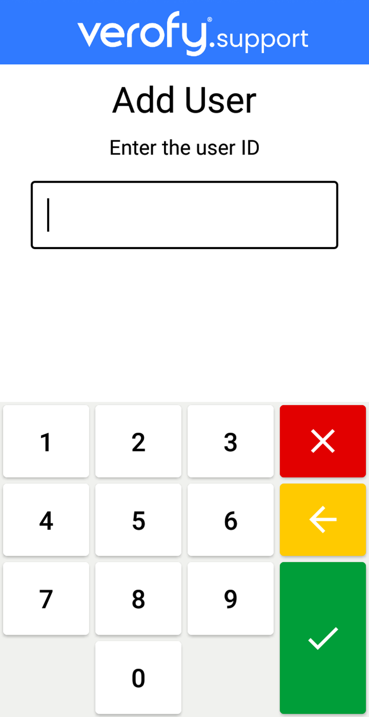 - Enter the User ID you wish to use for the new user. This should be 4 digits long. Once you've entered this, press the green tick.