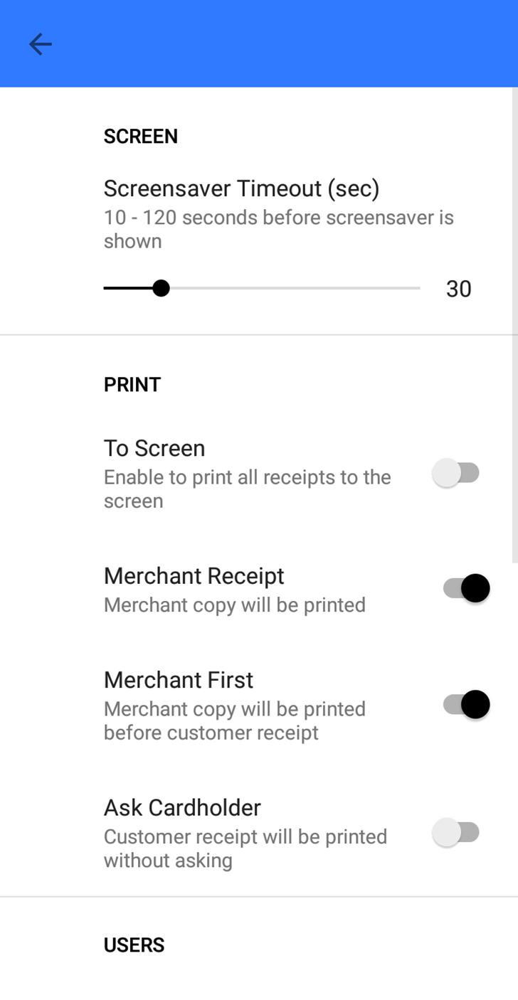 The preset print settings will look like this. This means both the Merchant and Cardholder copies of the receipts will print automatically after every transaction.
