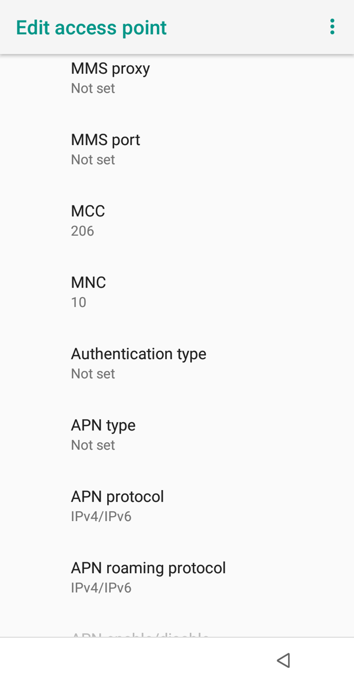 - Scroll down the page until you see the MCC and MNC fields - they should be pre-filled as shown below (MCC = 206, MNC = 10).