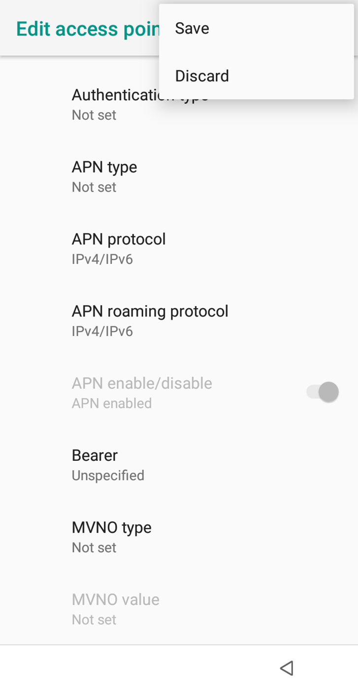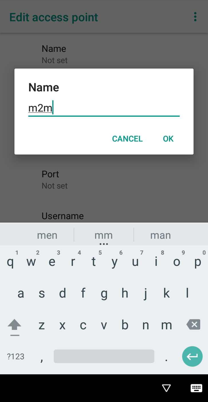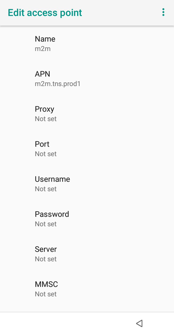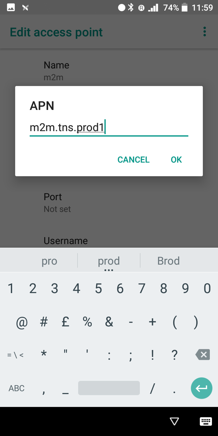 - Select the APN field and enter m2m.tns.prod1. Press ok.