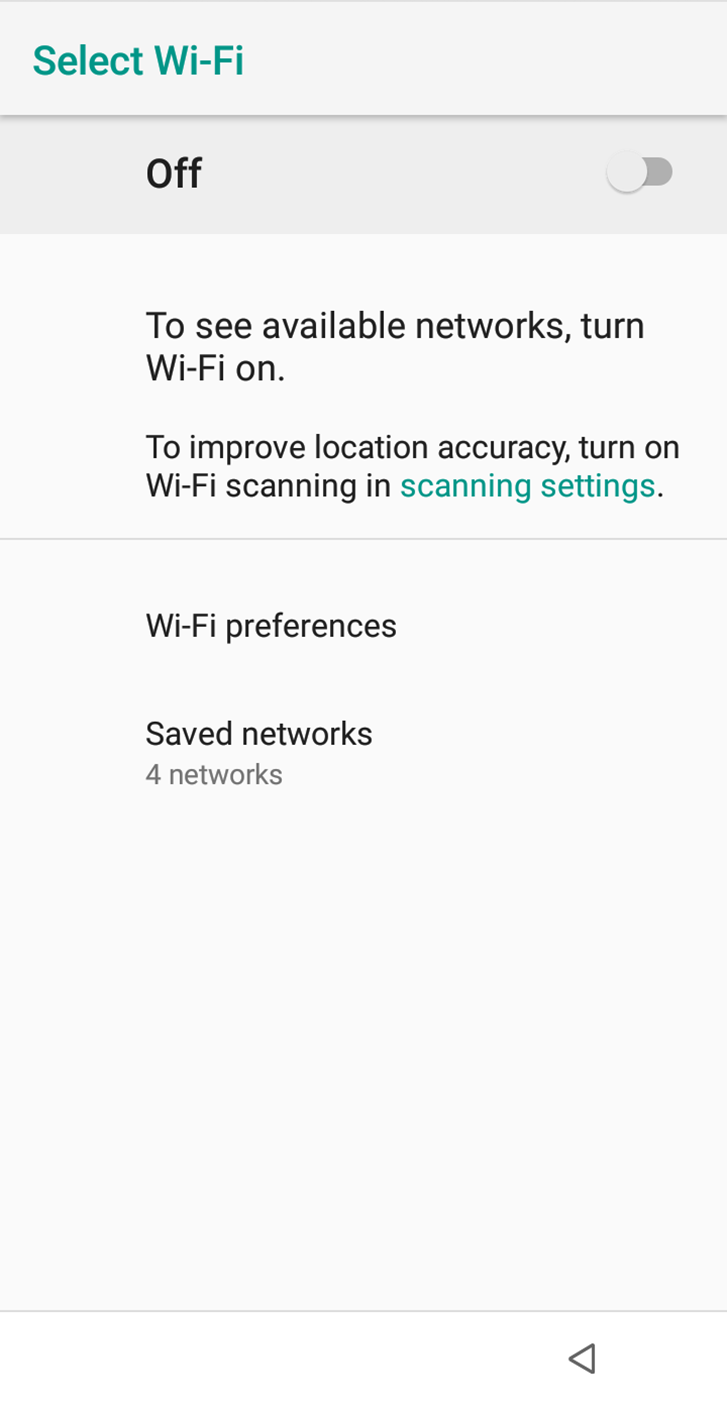 - To disable the Wi-Fi connection from the Verofy® Move, you simply need to toggle the Wi-Fi off using the toggle button at the top right of the screen. You'll then see the screen below. If you need to re-enable the Wi-Fi connection, just toggle the switch back on and the list of available networks will show.