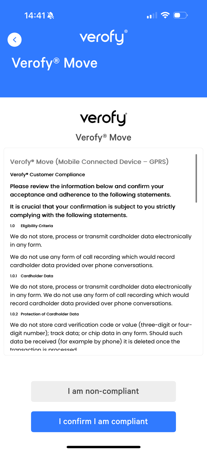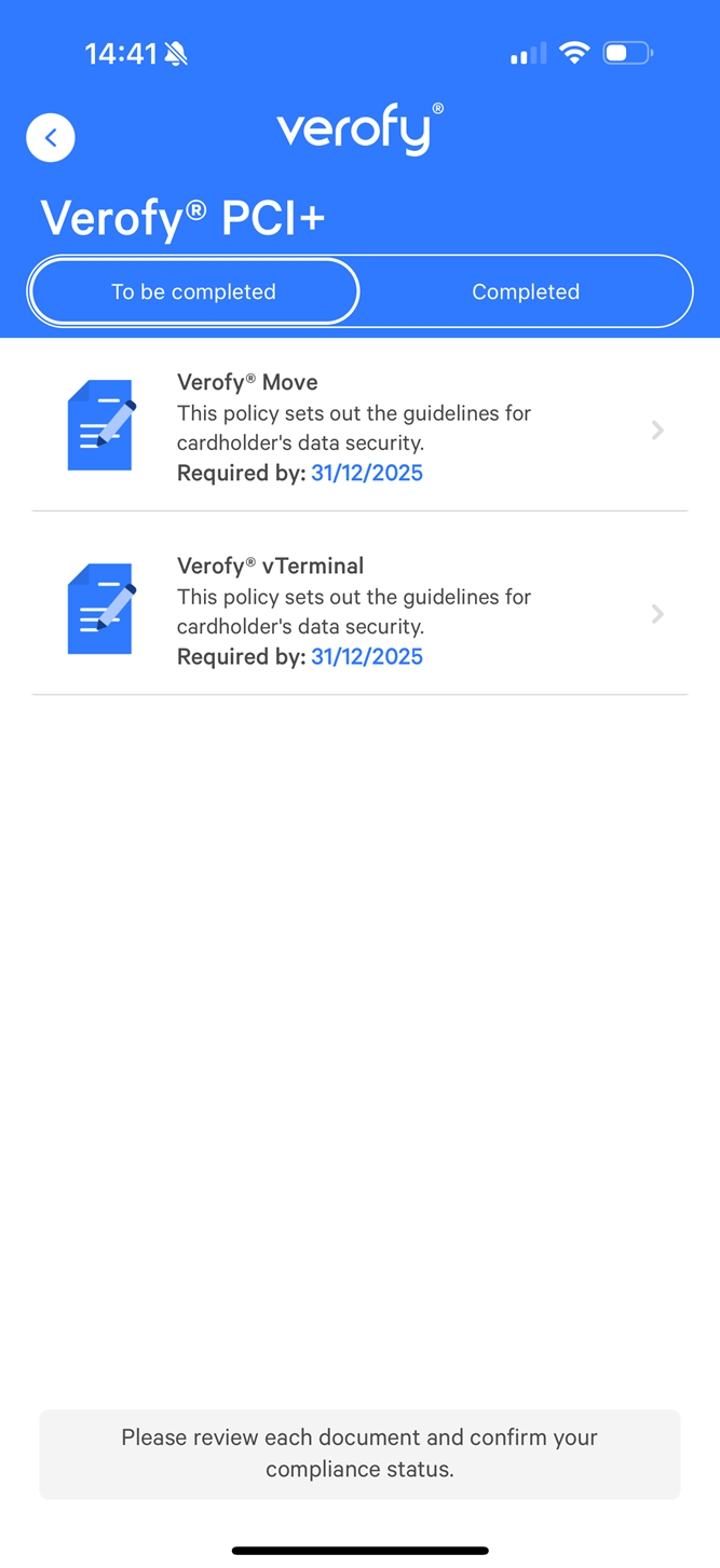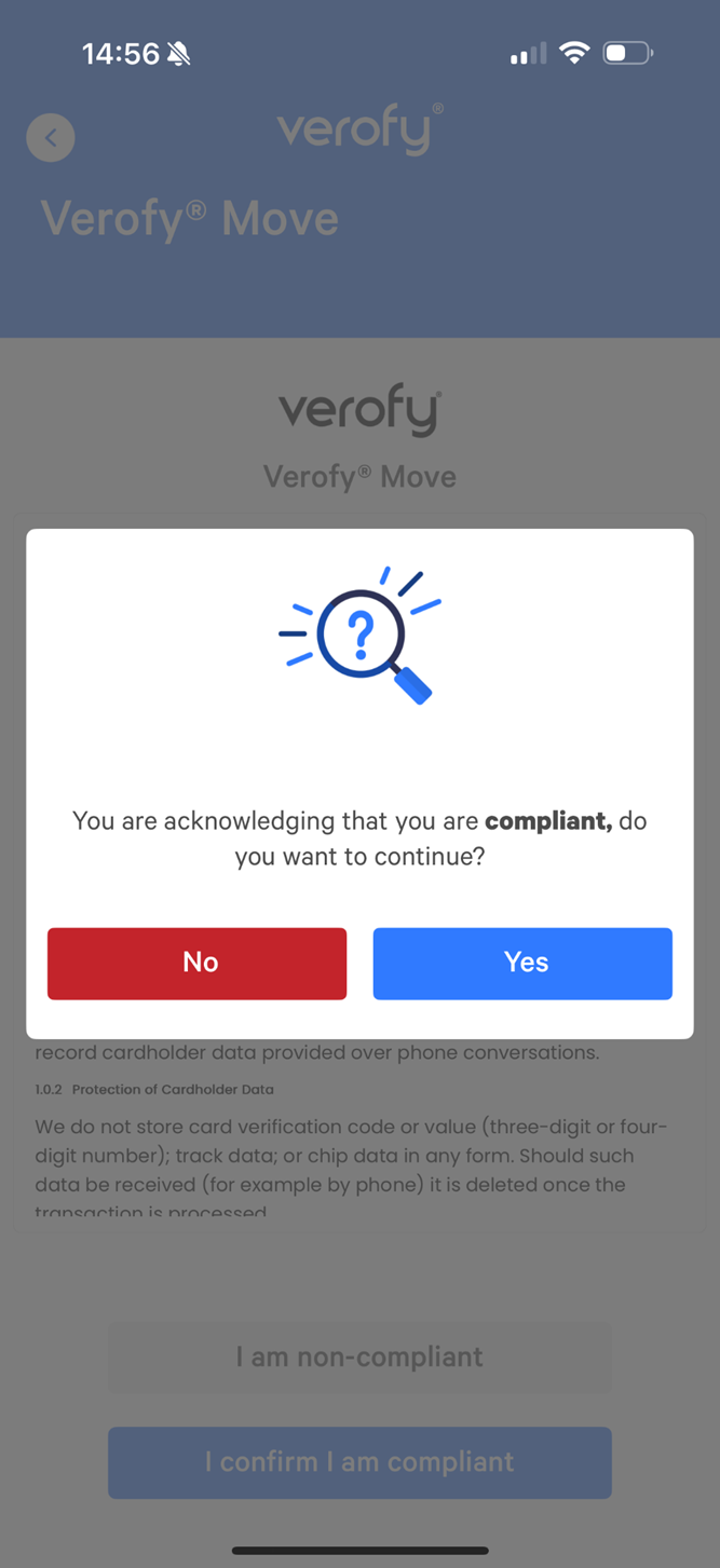 We'll let you know once it's time to complete your PCI compliance - you'll receive SMS and email reminders about completing this before the deadline. You might also see a pop up when you access the Verofy® App to notify you when it's time to complete your PCI.
