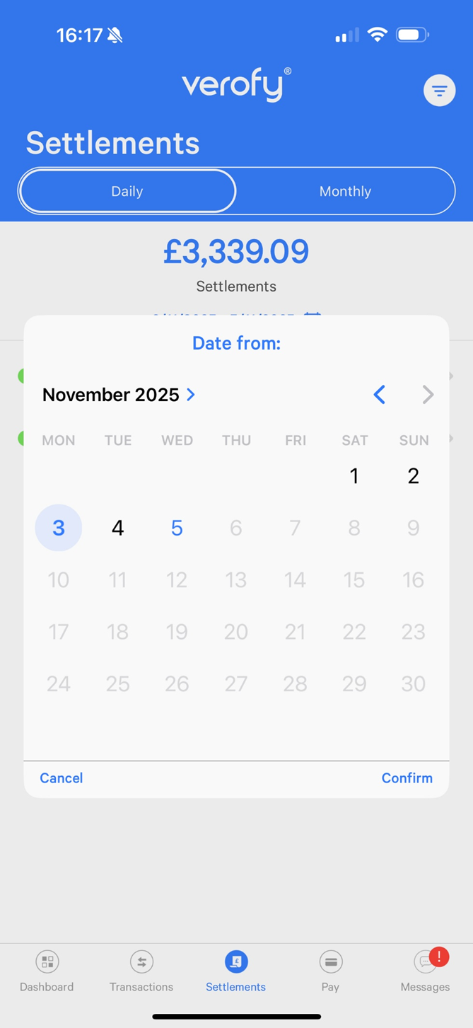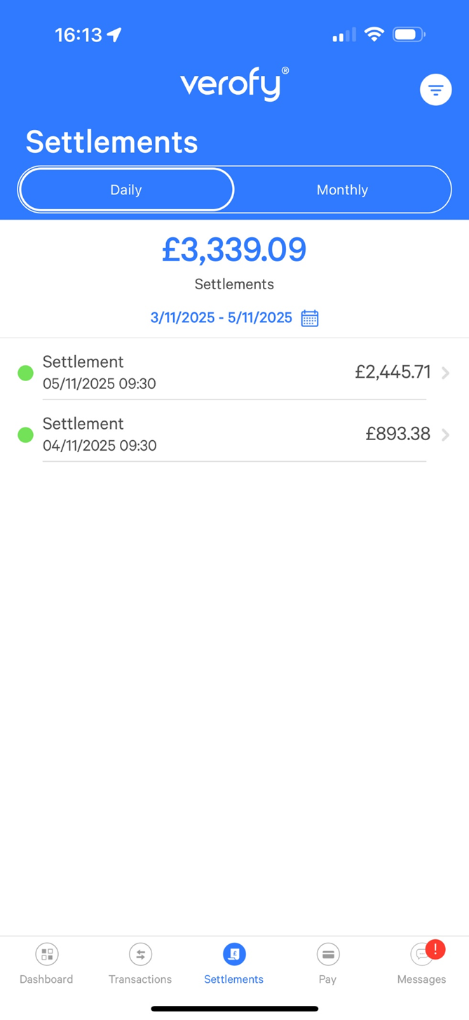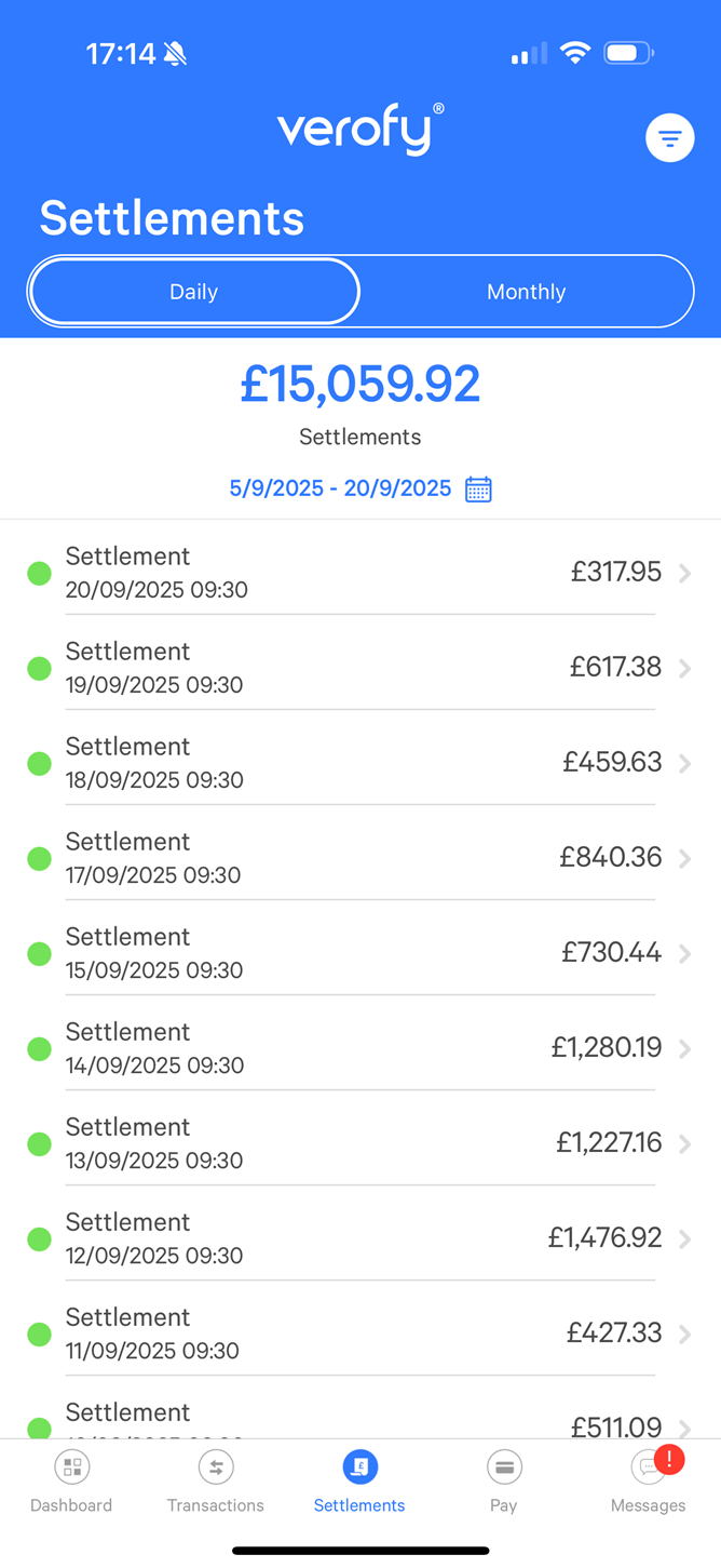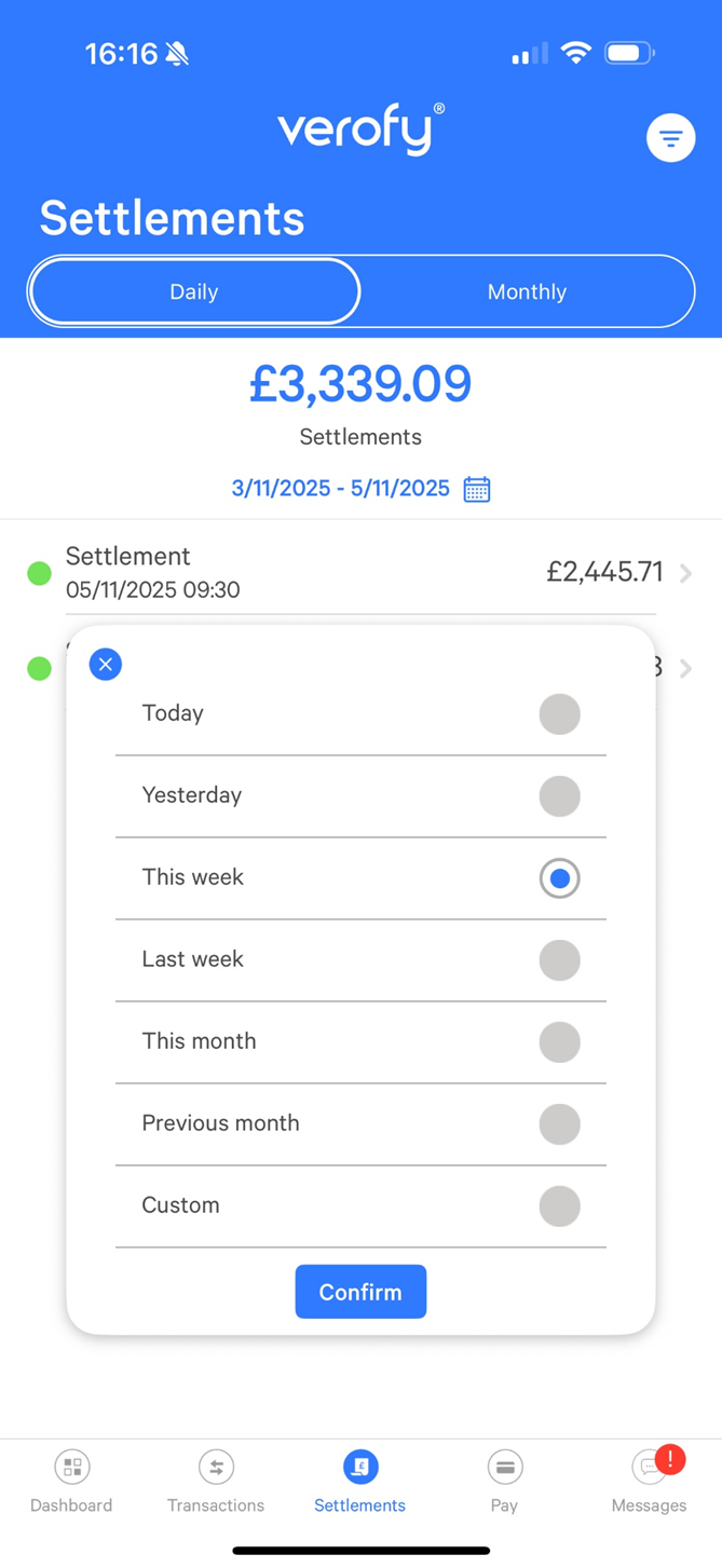 If you want to view settlements within a certain date range, you can do so using the filter options in your Verofy® App.