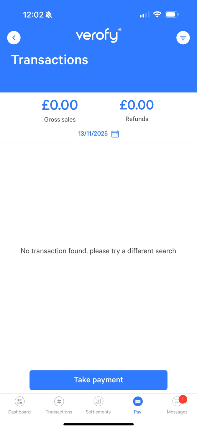 - Once you've pressed Get started, you'll see a list of all the transactions you've done on your Verofy® vTerminal. Press Take Payment to start a new transaction.