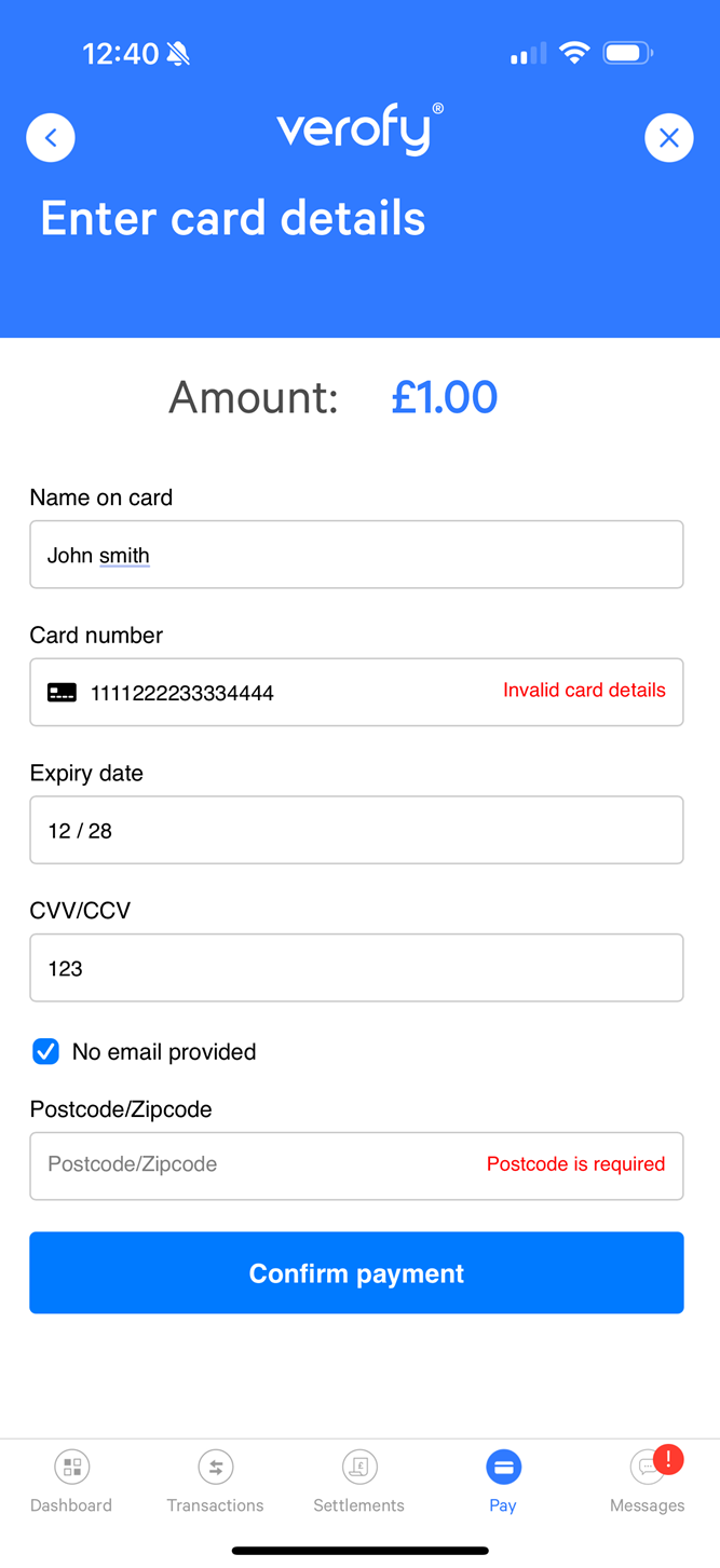 This page shows you how to take payments in the Verofy® App via your Verofy® vTerminal if you have this product.