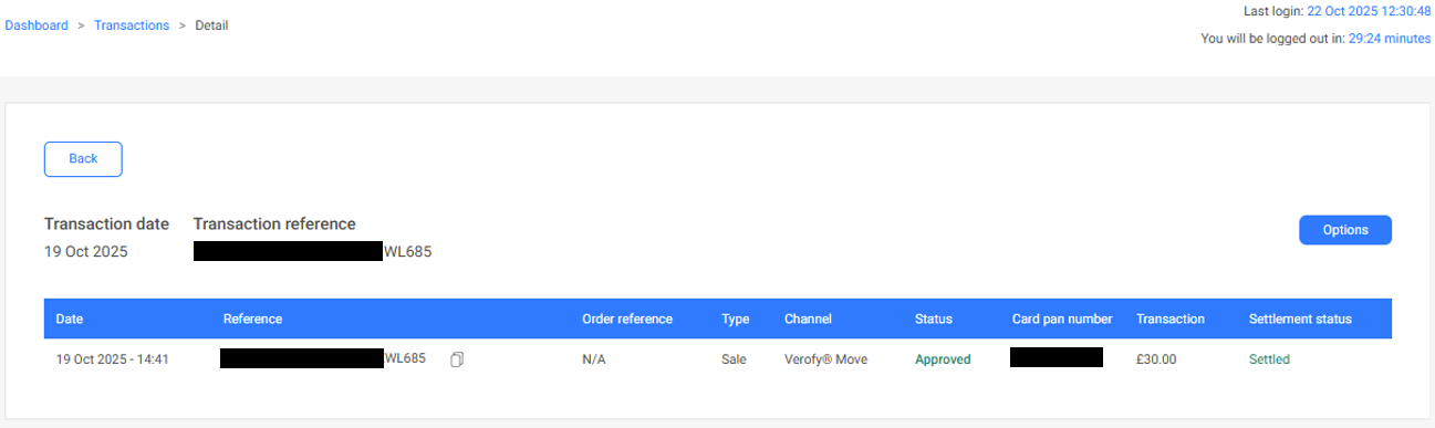You can easily view the detail about a specific transaction from Verofy® Cloud by clicking the three blue dots to the right of a transaction record.