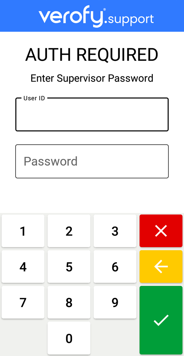 - The terminal will prompt that Authorisation is required. You'll need to enter the 'Supervisor' User ID and password to continue. Press the green tick to continue.
