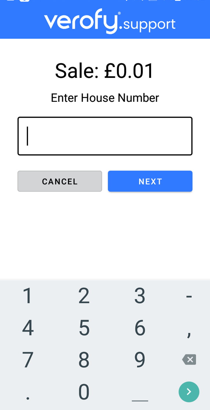 - You'll then need to enter the house name or number that the card is registered to. The customer should be able to provide this information to you. Once entered, press next.