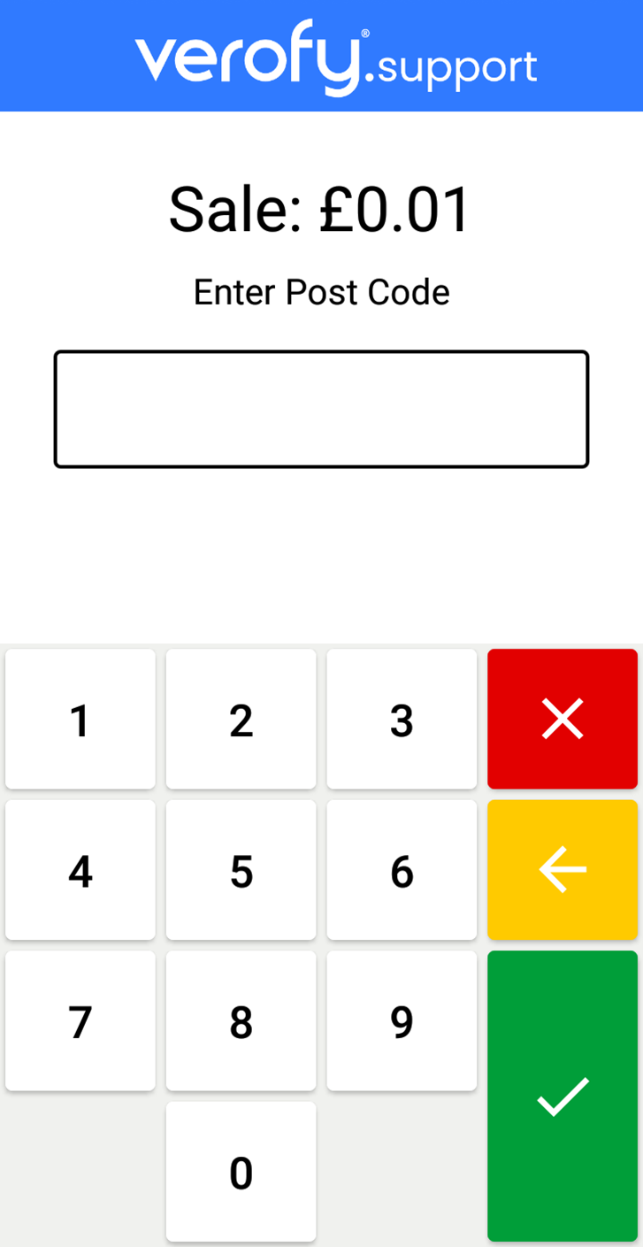 - Next, you'll need to enter the numbers only from the post code that the card is registered to. The customer should be able to provide this information to you. Once entered, press the green tick.