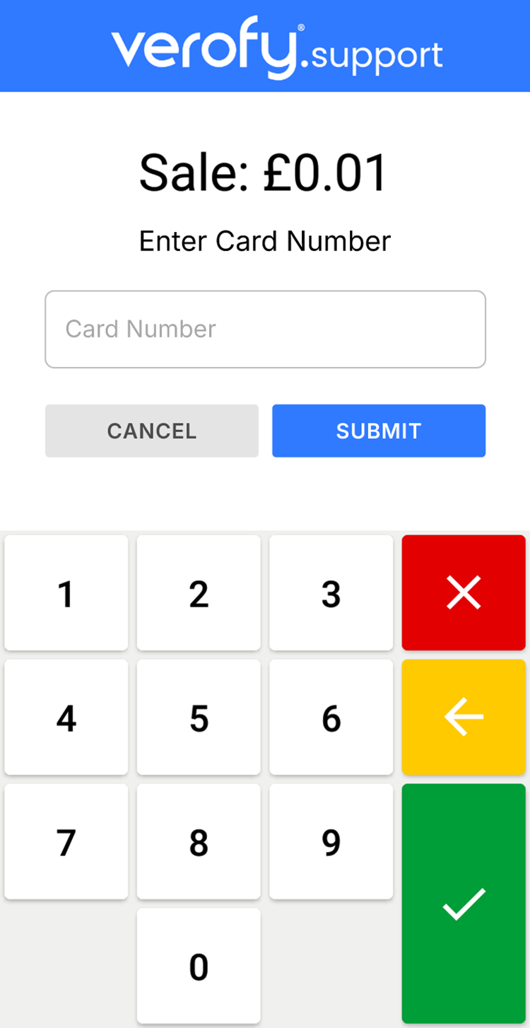 - You'll then need to enter the long 16 digit card number (the customer will need to confirm this to you). Once entered, press submit.